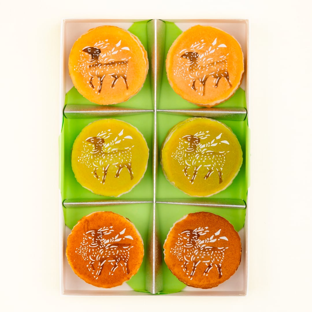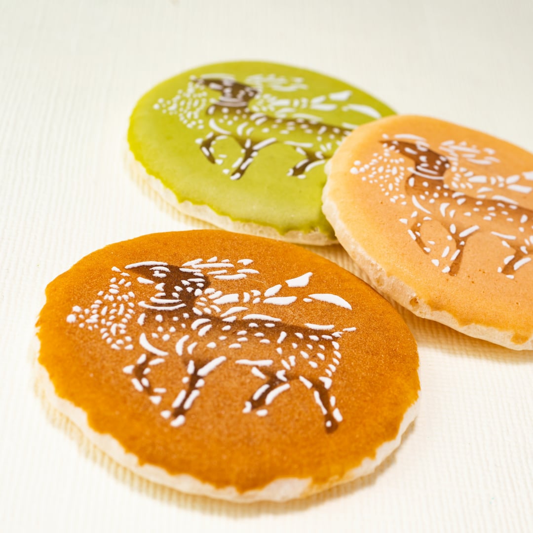 サクサクした食感の麩焼を糖衣し、砂糖で鹿の絵を描いた菓子です。